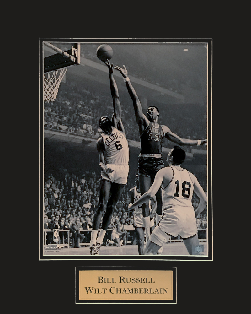 Bill Russell Wilt Chamberlain photo BW matted to 16×20. The Wilt Chamberlain photo with Bill Russell is an amazing basketball image with both athletes reaching high near the basket. This item is not framed unless you select the option for the cherry or black frame.